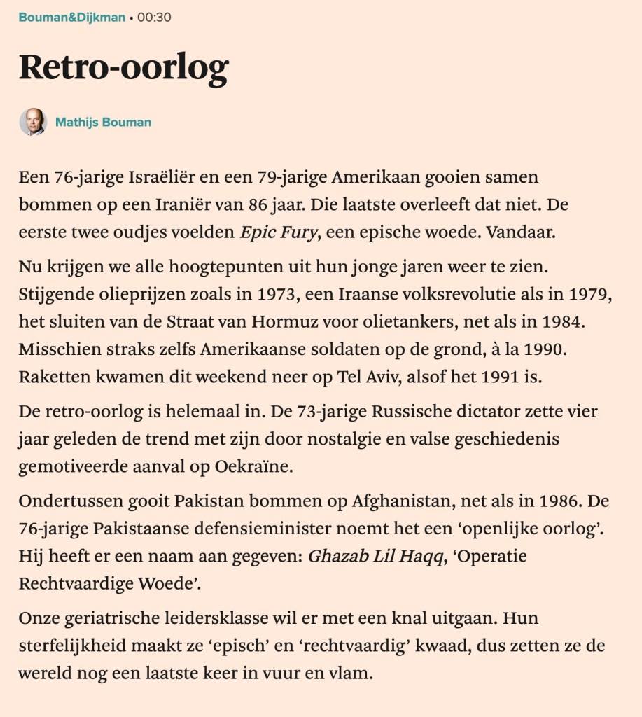 In het FD kijkt columnist Mathijs Bouman op deze manier aan tegen de huidige oorlogen.