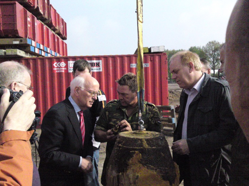 Op de foto de burgemeester van Gemert-Bakel Jan van Maasakkers en wethouder Jan Bevers, die uitleg krijgen over hoe de EOD de bom onschadelijk heeft gemaakt.