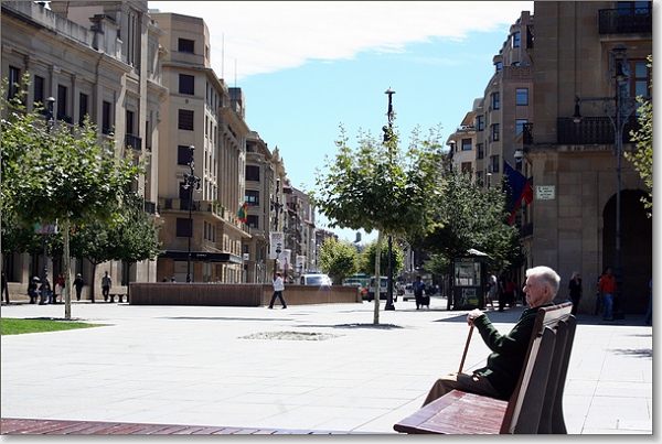 Toen we de Plaza Mayor in Pamplona opliepen, zat deze man er al. Tevreden rondkijkend op dit inderdaad erg mooie plein, zijn handen stevig rustend op z’n wandelstok.