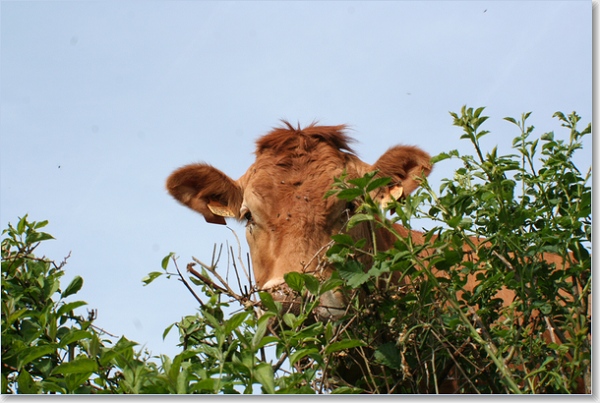De koe op deze foto dacht misschien dat ik haar niet gezien had. Zo sneaky stond-ze te gluren achter het groen tussen wandelpad en weiland op onze Luxemburgse wandelroute.