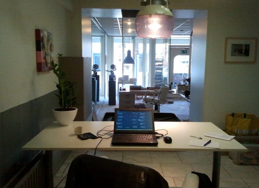 Van de ene flexplek naar de andere. Vanochtend interview gehad met flexwerker bij BC Traverse in Helmond. Nu zelf aan het flexwerken bij Vrijwerkers, ook in Helmond. Met uitzicht op de open haard en – net buiten beeld – de werkplek van vrijwerker Jan Vriends.