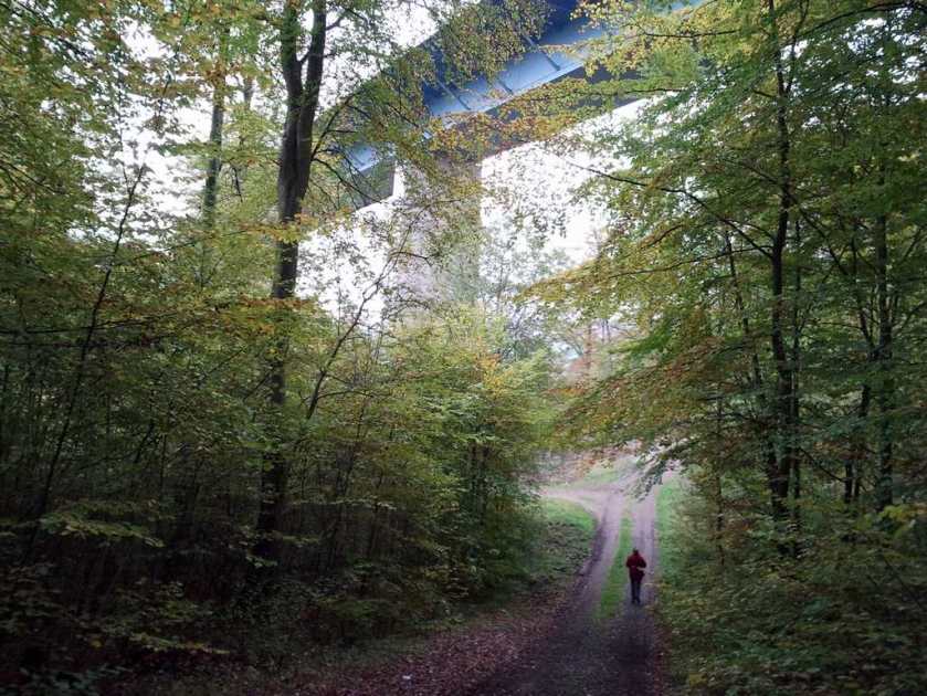 Je komt onder die weg door als je van Echternach naar Wasserbillig loopt. Als je met 130 over de snelweg zoeft heb je er nauwelijks erg in dat je over een gigantisch viaduct rijdt. Dat de natuur tot in de verre omtrek domineert. Zowel qua uitzicht als qua geluid.