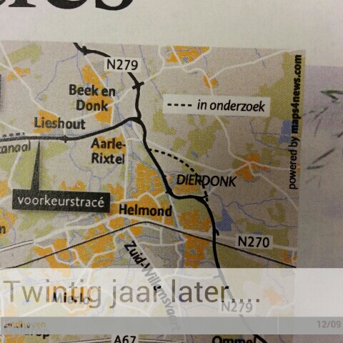 Inmiddels is het zo druk op die weg dat ie wordt uitgebreid van twee naar vier banen. En dat lukt ter hoogte van Dierdonk niet, daar is onvoldoende ruimte voor. Daarom komt ie alsnog met een boog om Helmond heen. Met instemming van Laarbeek, de gemeente waarin Aarle-Rixtel intussen is opgegaan.