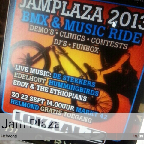 Op de Markt in Helmond vindt voor de deur van Lokaal42 zondag de eerste Helmondse Jam Plaza & Music Ride plaats: tal van BMX-fietsers laten er vanaf twee uur hun kunsten zien, bezoekers kunnen zelf ook op eenBMX aan de slag en er treden die middag vier regionale groepen op: de Stekkers, de Hummingbirds, Edelhout en Eddy & de Ethiopians.