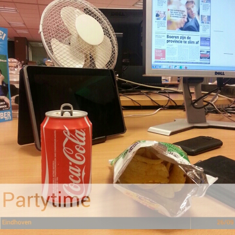 Zo, de krant van morgen/straks is klaar. Tijd om even te ontspannen met een versnapering: Partytime hier @deredactie! #chipsencola