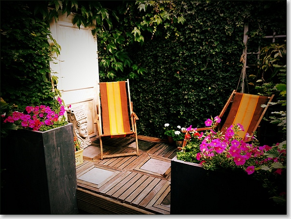 Daarom op speciaal verzoek een foto van wat ik in gedachten ons Piet Hein Eek-terras genoemd heb, omdat het is gemaakt van afdankers, spullen uit de kringloopwinkele en van Marktplaats en – eerlijk is eerlijk – twee nieuwe plantenbakken (met opruimingskorting).