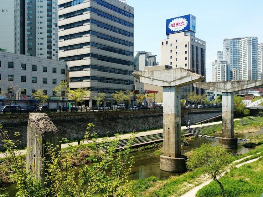 Er zijn in Seoul nog meer snelwegen in onbruik geraakt, merkten we tijdens onze tochten door die stad tijdens onze meivakantie. Zoals die op de foto hierboven: het wegdek is weg, maar de pijlers staan er – al dan niet gedeeltelijk – nog wel. Die staan nu in een alleraardigst stroompje.