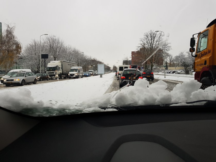 Nou, dat heb ik geweten. Nadat het tegen enen ophield met sneeuwen en ik net onderweg was, zat het verkeer ook in hartje Eindhoven al muur- en muurvast. Van Strijp-S naar de Berenkuil kostte me een uur en een kwartier. Van de Berenkuil naar huis nog eens een half uur.