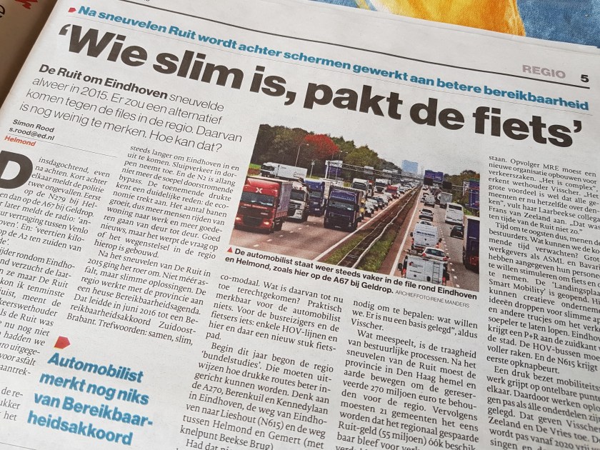Dus daar kan ik het mee doen, met de boodschap dat ik beter de fiets kan pakken. En niet alleen ik, maar ook die duizenden andere mensen die dagelijks in de ochtendspits in de file staan op weg van Helmond naar Eindhoven. Op weg naar hun werk om de motor van de Nederlandse economie, Brainport geheten, draaiende te houden. En die omgekeerd ‘s avonds onderweg van Eindhoven naar Helmond ook weer in de file staan.
