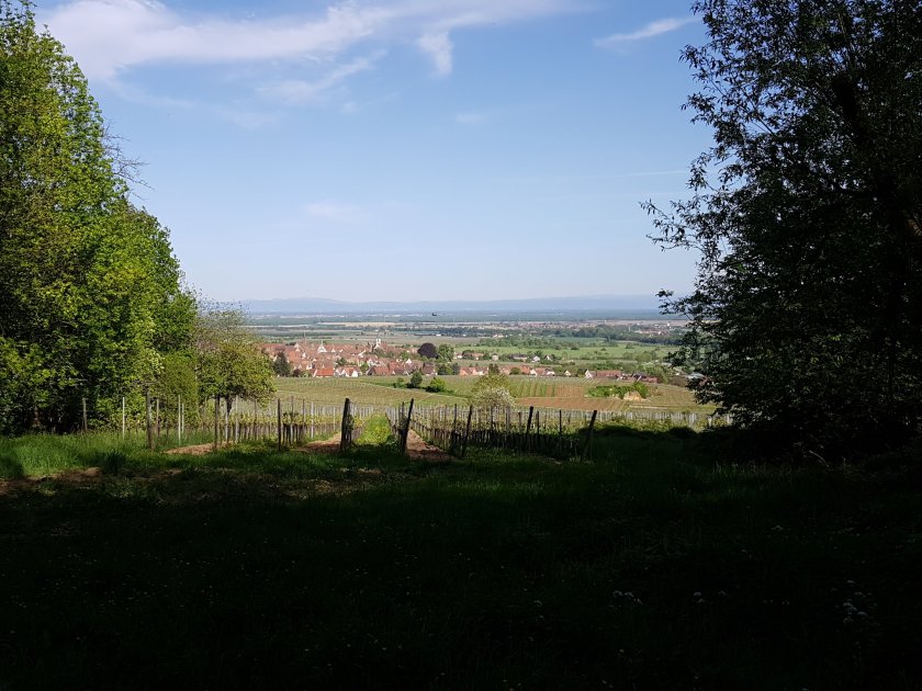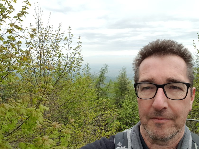 Aardige col, die Ungersberg hier in de Vogezen. Iets meer dan 900 meter hoog en dat is flink klimmen. Gelukkig is het uitzicht de moeite waard, ondanks de nevel. Ergens in de verte moet Parijs liggen.