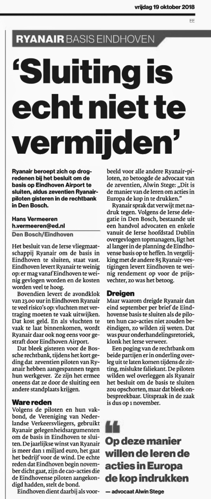 Donderdag een groot deel van de dag in de rechtbank gezeten. Bij het kort geding tussen een aantal piloten en hun werkgever, Ryanair. Hierboven het nieuws van die zitting kort samen gevat. Schokkend om te horen hoe deze werkgever zijn personeel behandelt. Mensen die soms al twaalf tot vijftien jaar in dienst zijn, worden rücksichtslos aan de kant geschoven. En dat allemaal ten gunste van winstmaximalisatie, zo geven deze Ieren zelf zonder blikken of blozen toe.