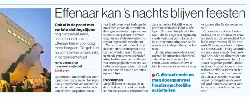 Vreselijk woord: verlaatjes. Wordt een proef met tot in het ochtendkrieken verlengde sluitingstijd mee bedoeld. Dat u dat maar weet. De Effenaar kan er voorlopig van blijven profiteren, met dank aan Groenlinks in de Eindhovense gemeenteraad. En dat om de stad ook ‘s nachts te laten bruisen.