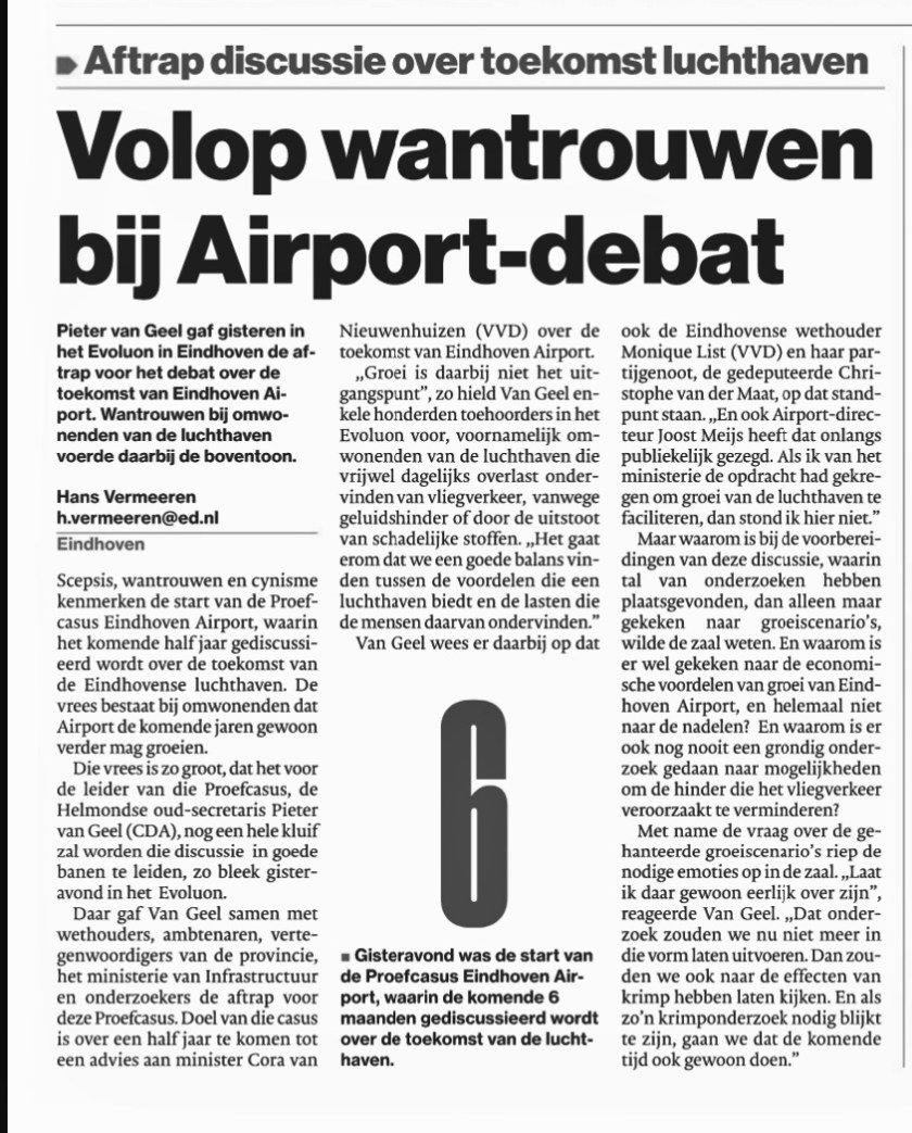Een muur van wantrouwen die moeilijk te slechten is. Dat was, kort samengevat, de conckusie gisteravond in het Evoluon. Of zal het Pieter van Geel de komende maanden wel lukken met een – zoals dat zo mooi heet – breed gedragen advies over de toekomst van Eindhoven Airport te komen.