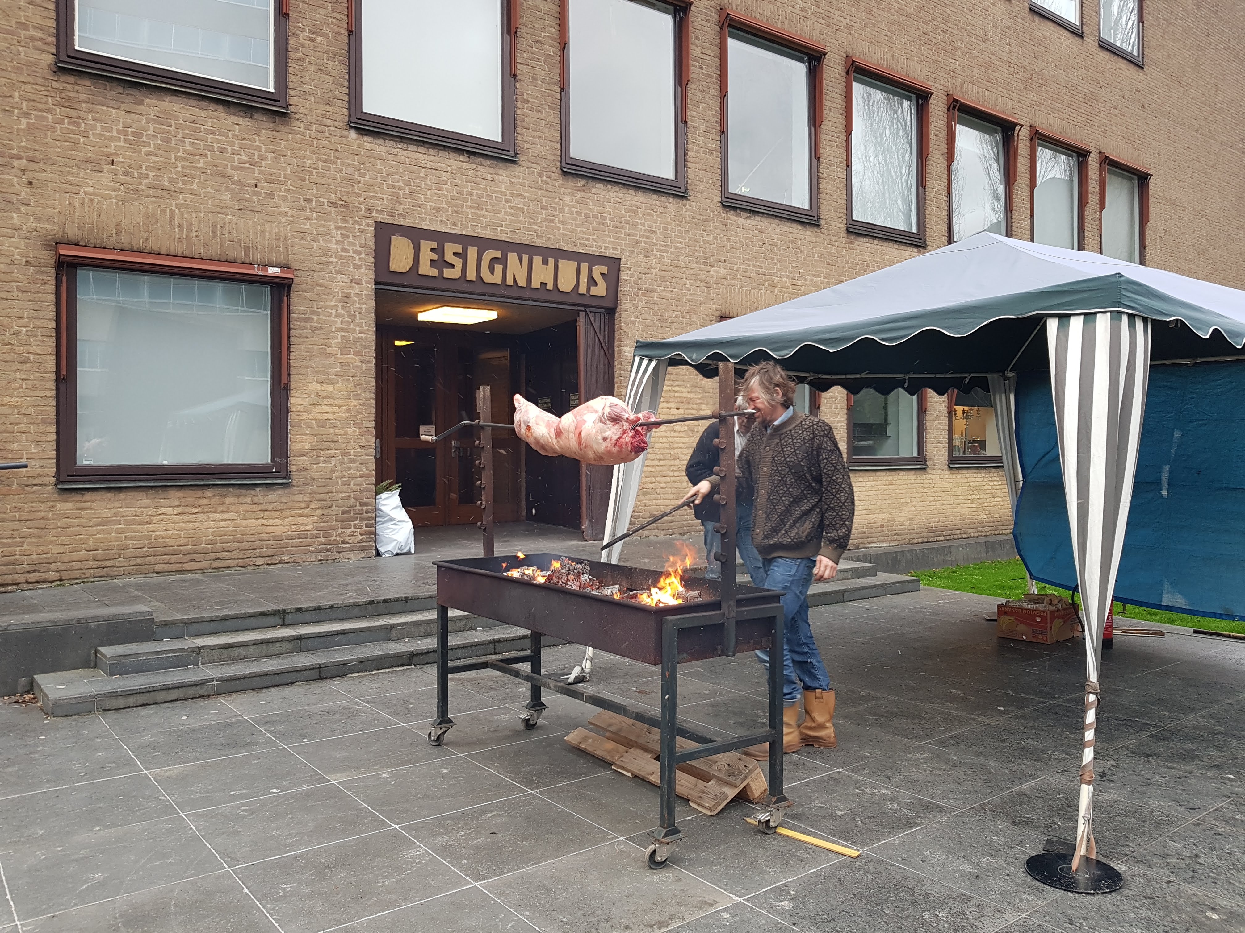 Soms kom je de meest merkwaardige dingen tegen, als je onderweg bent in het centrum van de stad naar een lunchafspraak. Een varken aan het spit, dat zie je niet elke dag. De laatste keer dat ik dat zag was op het platteland in Kroatië, heel wat jaren geleden alweer.