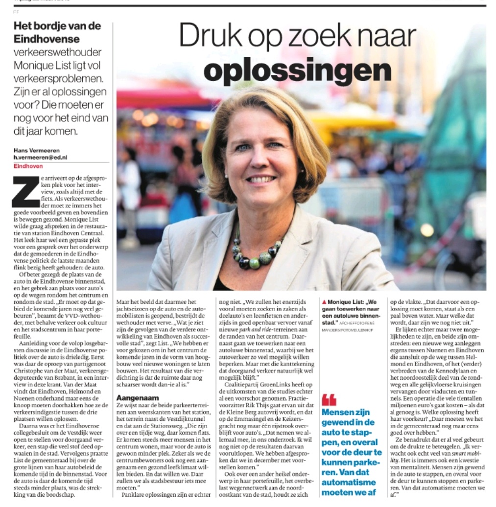 Het was de afgelopen weken een veelbesproken onderwerp in de Eindhovense politiek: het verkeer. Het ging over de veranderende plek van de auto in de binnenstad, het verstopte wegennet tussen Helmond, Nuenen en Eindhoven en de indigestie op de rondweg in de noordoosthoek van de stad. Ik sprak daar uitgebreid over met VVD-wethouder Monique List, die werkt aan oplossingen voor die problemen.