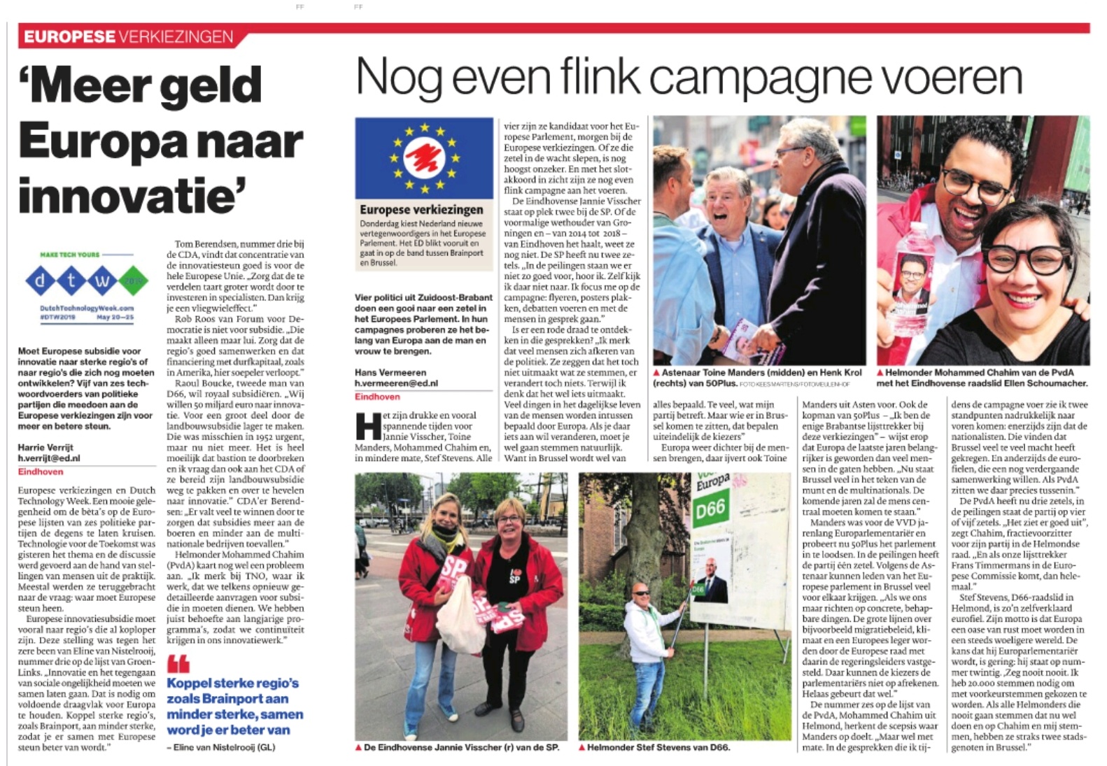 Ook gisteren en vandaag staan voor mij in het teken van Europa. In de krant van vandaag een korte versie van de interessante gesprekjes die ik had met de vier EP-kandidaten uit onze regio. Vanochtend was ik bij een Europadebat op de afdeling zorg en welzijn van het Eindhovense Summa Collega, waar leerlingen in discussie gingen met kandidaat-Europarlementariërs. Daarvan verslag in de krant van donderdag.
