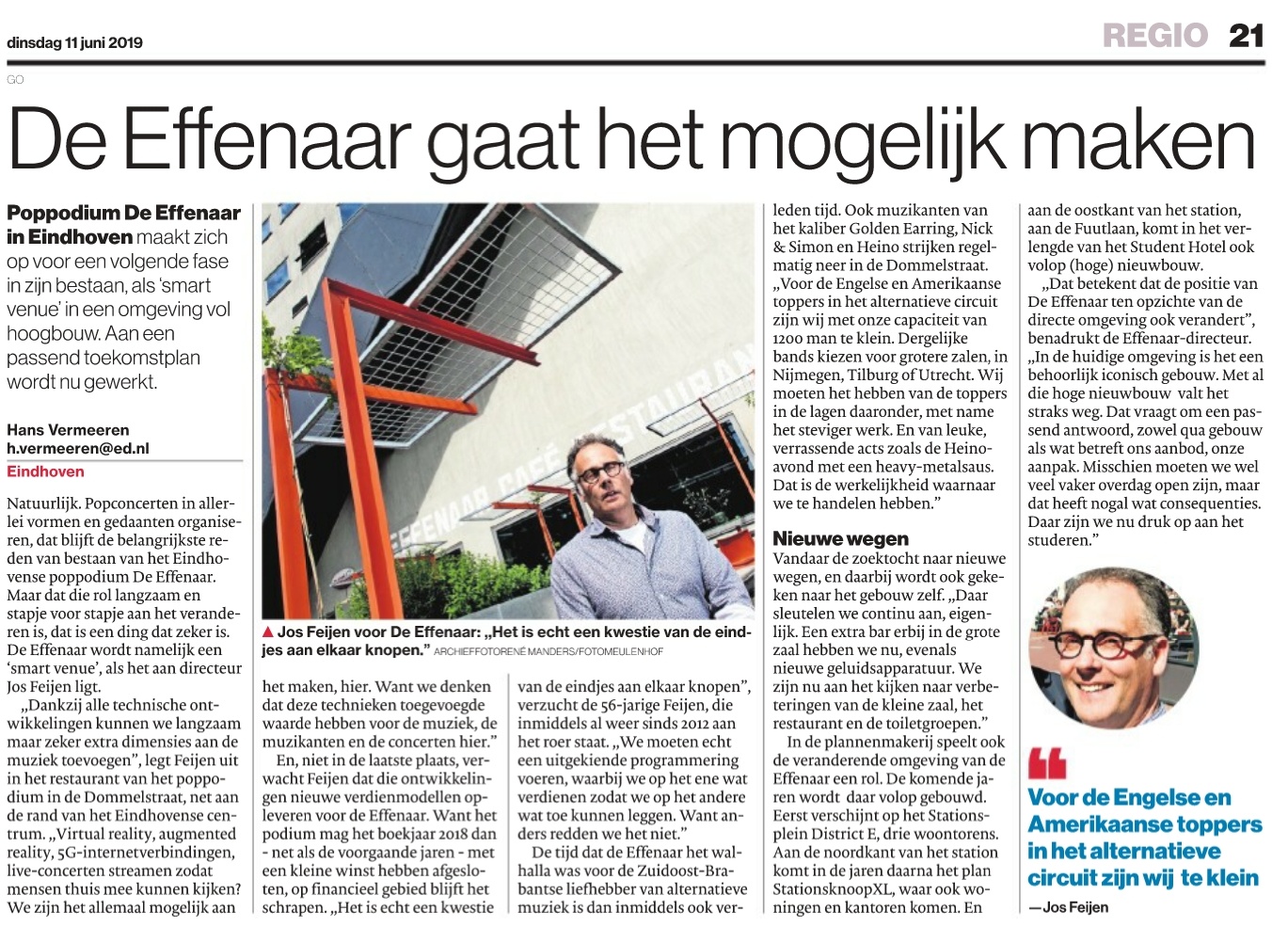 De tijden dat ik met een leren jack aan naar punk- en newwave-concerten in de Effenaar ging liggen ver achter me. Toch kom ik er nog regelmatig, maar dan meestal beroepshalve. Met name om bij te praten met directeur Jos Feijen. Vandaag vertelt hij in de krant over de toekomstplannen van de Effenaar. Hier is dat verhaal ook te lezen.