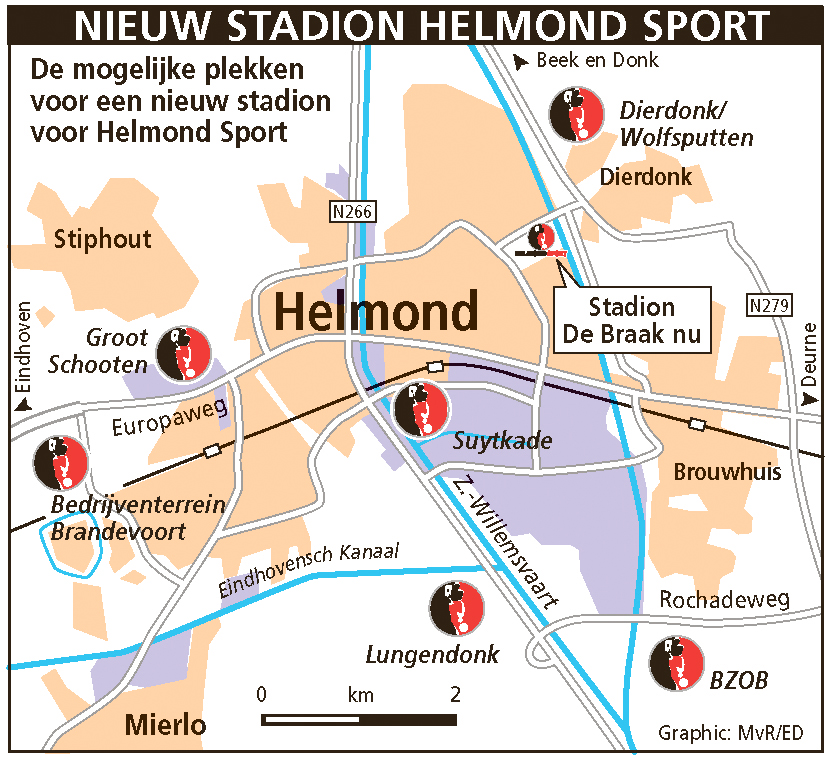 In mijn archief kwam ik een kaartje tegen dat oud-ED-collega Maarten van Roessel gemaakt heeft, en waarop de plekken staan waar mogelijk een nieuw Helmond Sport zou kunnen worden gebouwd.