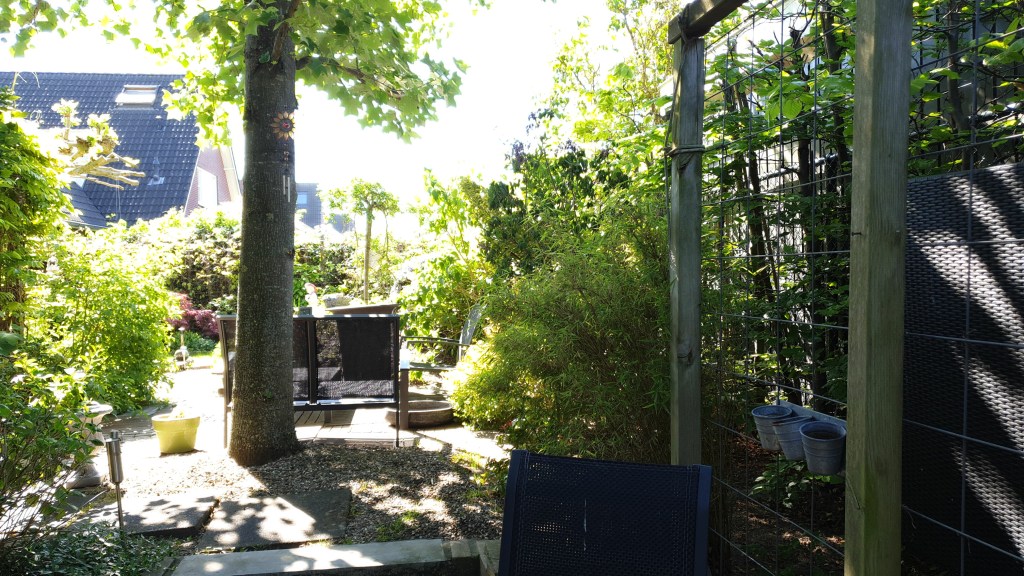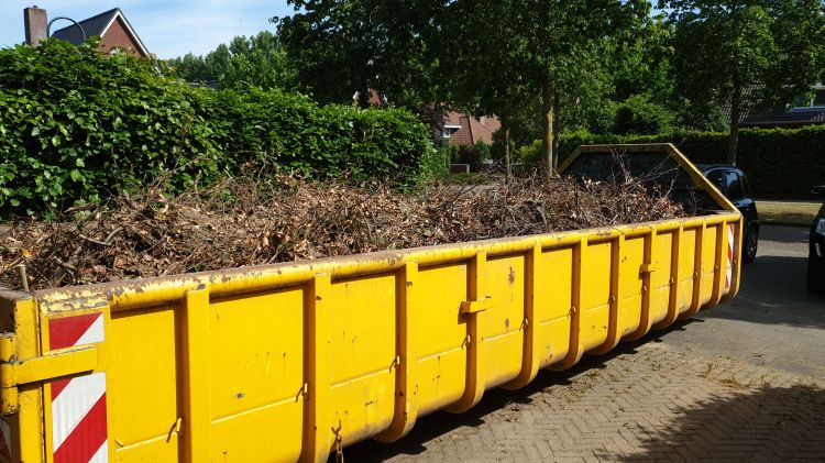Ook dit is een voortuin, maar dan in onttakelde staat. Ziet er toch heel anders uit zo, in gedemonteerde vorm: een flinke container die de restanten van al die struiken, planten, heesters en bomen bevat.