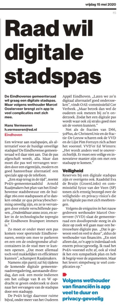 Saillant is ook de reacties in de stad op een digitale pas overwegend negatief lijken te zijn. Of de gemeenteraad de Eindhovenaren daar meteen ook GSM bij cadeau doet, bij die app, is de meest gehoorde kritiek.