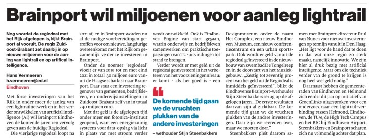Een dag nadat bekend werd dat een verbreding van het door files geplaagde deel van het Eindhovense wegennet er niet in zit, komt het bericht dat Brainport wel geld wil voor de aanleg van een lightrail op de as van regio: tussen de Automotive Campus in Helmond, de TU/e, Eindhoven Airport en de High Tech Campus en ASML.