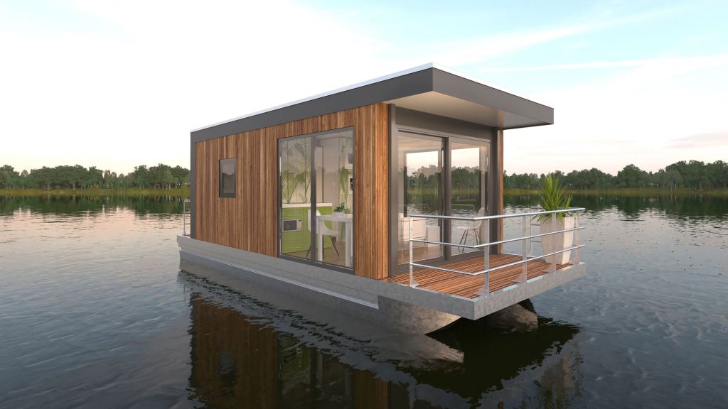 …I will drijf away. Drijvende tiny houses (floating klinkt niet). Gemaakt in Helmond en via Funda te koop.