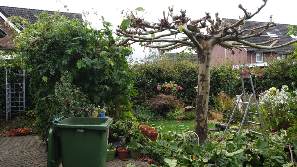 Elk jaar hetzelfde, elk jaar in oktober weer een uitdaging: hoe krijg ik alle takken en bladeren van een teruggesnoeide dakplataan in de groene bak. Niet dus.