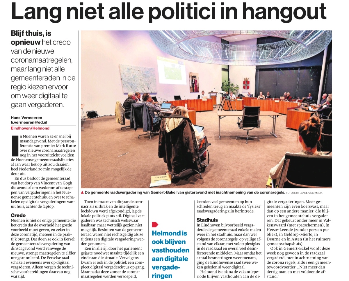 ‘Blijf thuis’ zijn de eerste twee woorden in bovenstaand verhaal. Maar dat geldt nog niet voor iedereen. Veel politici gaan nog de deur uit, om te praten over het beleid in hun gemeente. Terwijl dat toch ook net zo goed thuis van achter de laptop kan. Hier staat de online-versie van dit verhaal.