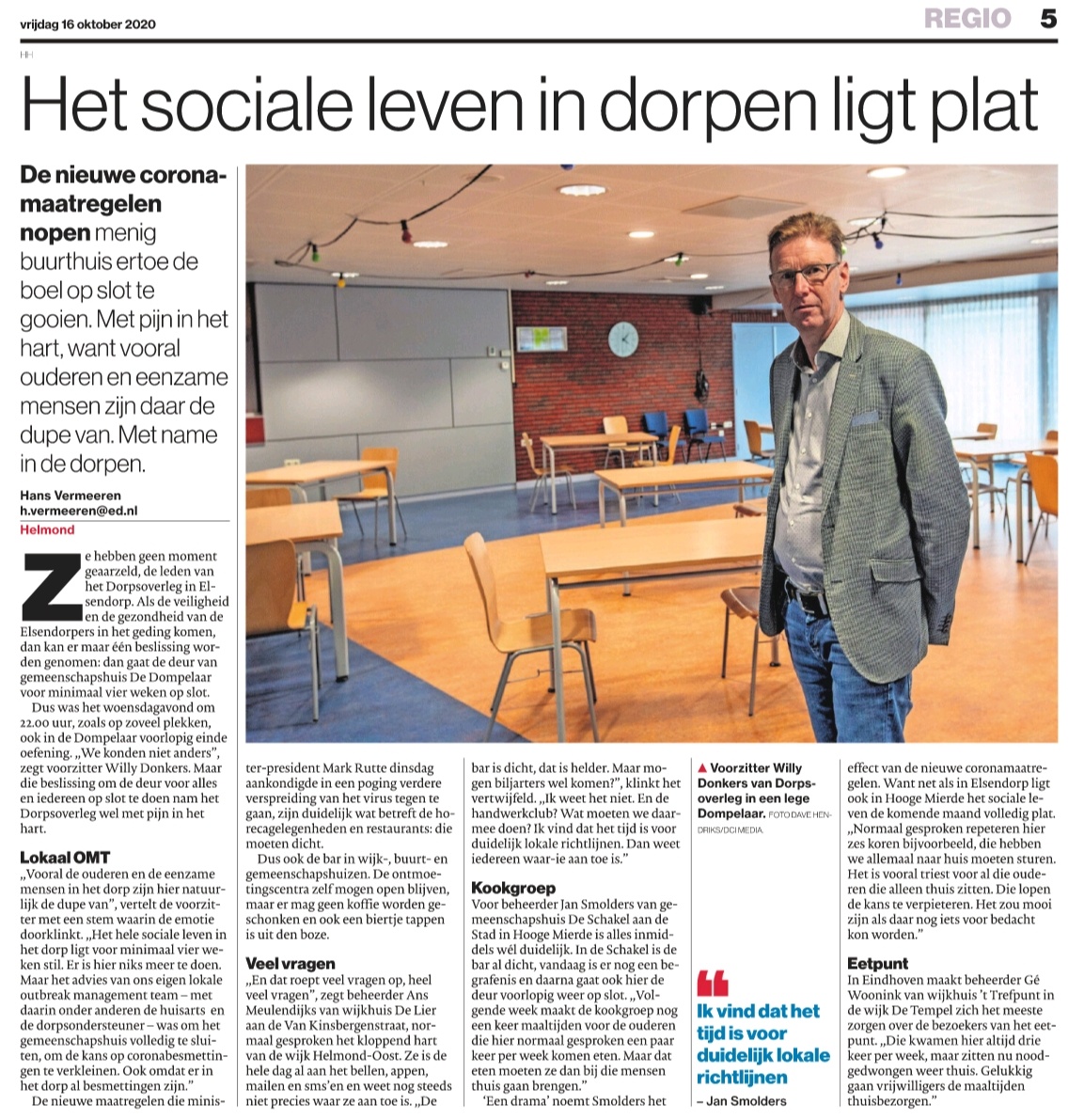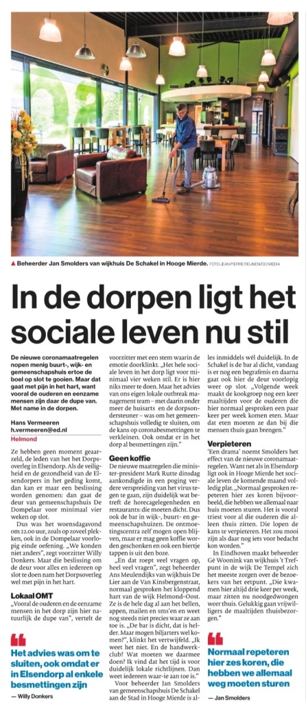 Minstens vier weken niet naar het café of een restaurant kunnen, de gevolgen van de dinsdag afgekondigde gedeeltelijke lockdown zijn ingrijpend – niet in het minst voor de ondernemers in de horeca natuurlijk. Maar ook de buurt-, wijk- en gemeenschapshuizen zijn of gaan (weer) dicht. En de gevolgen daarvan zijn even verstrekkend, met name in de dorpen op het platteland.