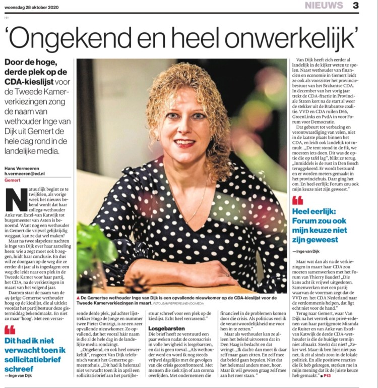Veel andere politici uit Zuidoost-Brabant gingen haar voor, de afgelopen decennia. Maar een Tweede-Kamerlid uit Bakel? Voor zover valt na te gaan wordt Inge van Dijk van het CDA in maart van het volgend jaar de eerste.