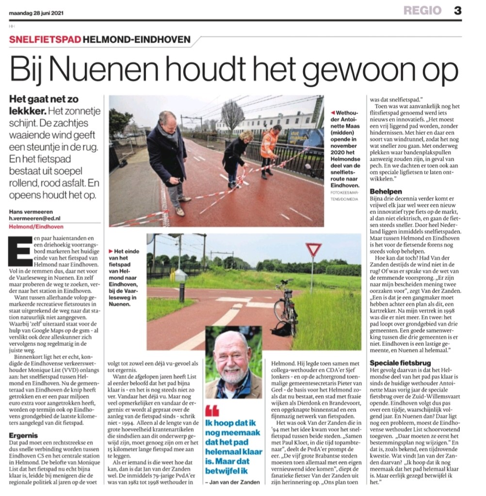 Even terug naar 1994 en naar de krant van gisteren, waarin ik in de historie dook van het snelfietspad tussen Helmond en Eindhoven. Zevenentwintig jaar geleden bedacht, maar nog steeds niet aangelegd.
