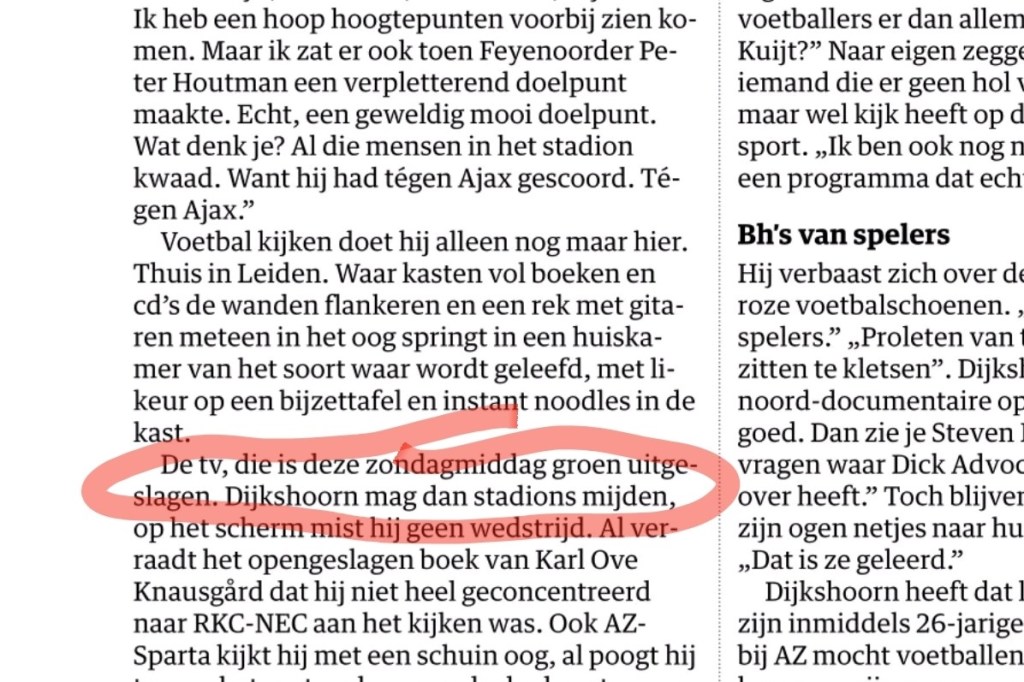 Alleen al voor dit soort zinnen zou je toch een krant gaan lezen? Observatie in een interview met schrijver, dichter en voetballiefhebber Nico Dijkshoorn, deze week in NRC.