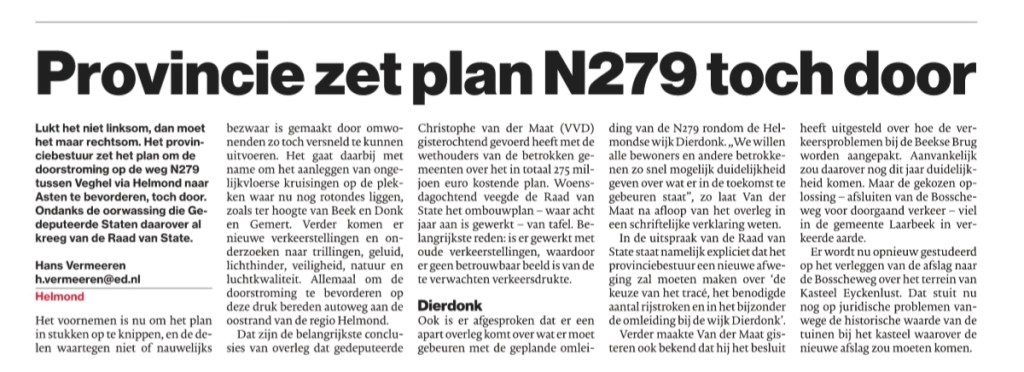 De Raad van State heeft een van de belangrijkste onderdelen van de plannen om iets aan die bereikbaarheid te doen vanochtend onderuit gehaald. Het plan om de doorstroming van het autoverkeer op de N279 – de weg tussen Veghel, Helmond en Asten – te verbeteren, is van tafel geveegd.