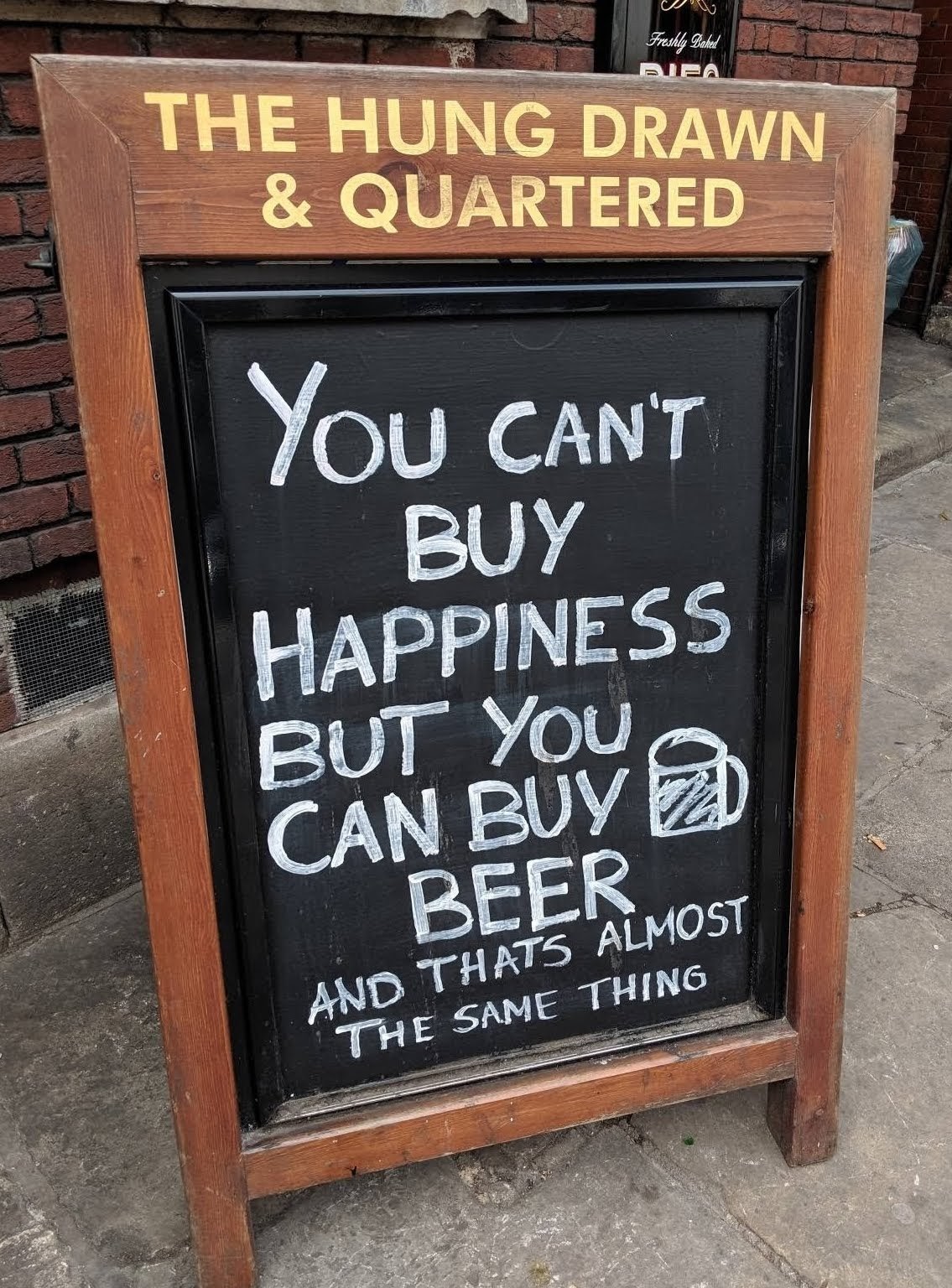 Gevonden op Google Maps, deze foto van een bord voor de deur van een van onze favoriete pubs in hartje London. Het is een lichtelijk overdreven stelling, maar een biertje van de tap in the Hung, Drawn & Quartered komt niettemin aardig in de buurt.