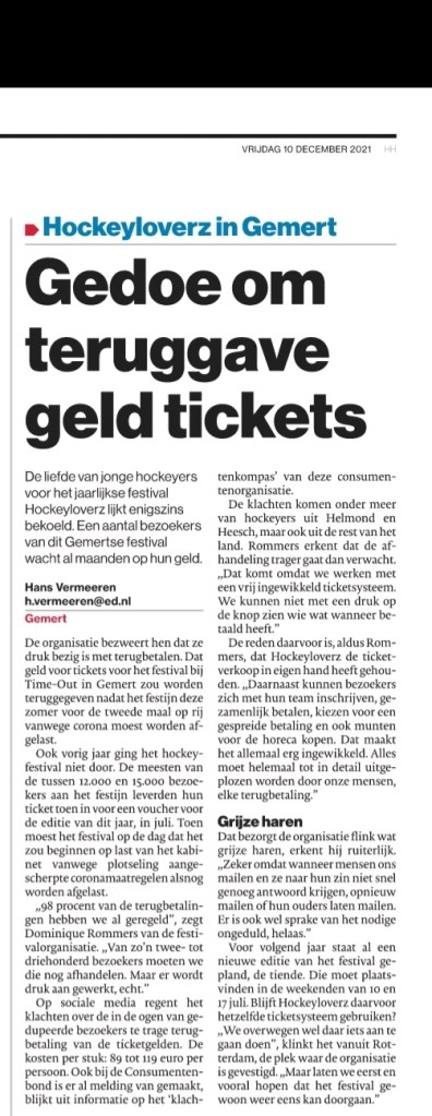 Vandaag in de krant aandacht voor het tot twee maal toe afgelaste Hockeyloverz in Gemert.