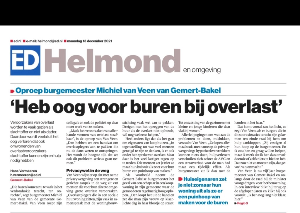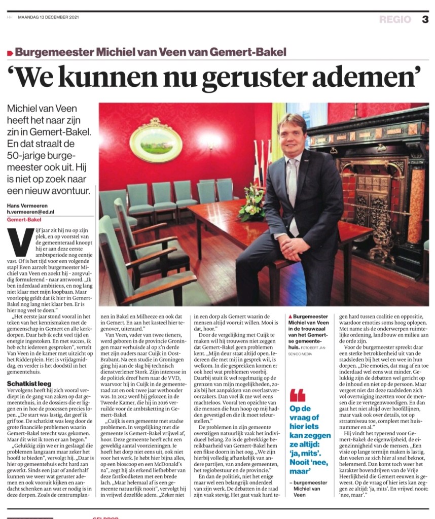 Michiel van Veen is een vlotte gesprekspartner. De burgemeester van Gemert-Bakel weet moeiteloos een groot deel van deze maandagkrant te vullen. Met een terugblik en door vooruit te kijken, en met een opmerkelijke oproep.