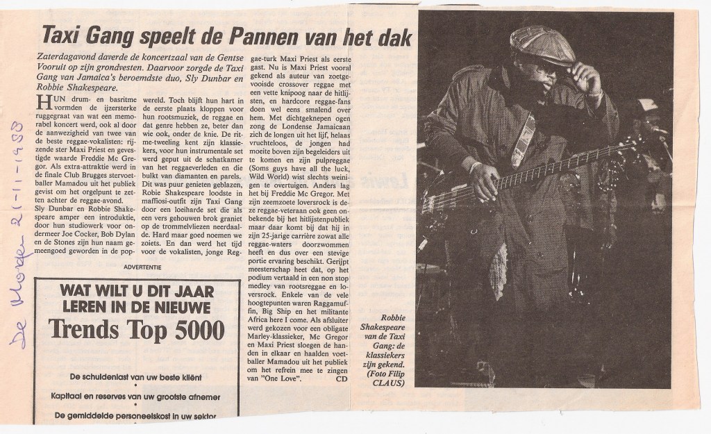 Deze recensie van een concert in de Vooruit in Gent komt uit 1988, uit de Morgen. Ik heb em opgezocht in mijn archief nadat ik zojuist las dat Robbie Shakespeare is overleden, op 68-jarige leeftijd.