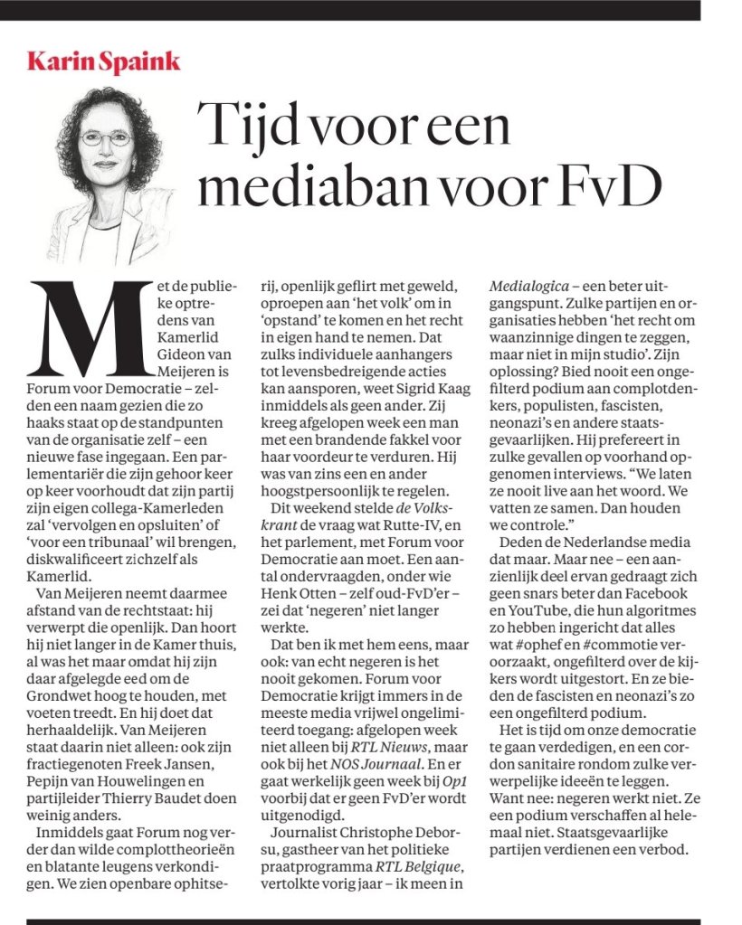 Al een dag of tien loop ik me het hoofd te breken over deze column van Karin Spaink in Het Parool. Haar stelling, kort samengevat: Forum voor Democratie is een staatsgevaarlijke partij omdat de leden de grondwet consequent met de voeten treden en moet daarom verboden worden.