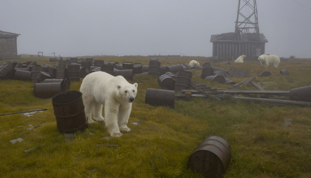 Prachtige surrealistische fotoserie bij de Volkskrant vandaag, over ijsberen die in leegstaande dorpjes op de toendra zijn gaan wonen.