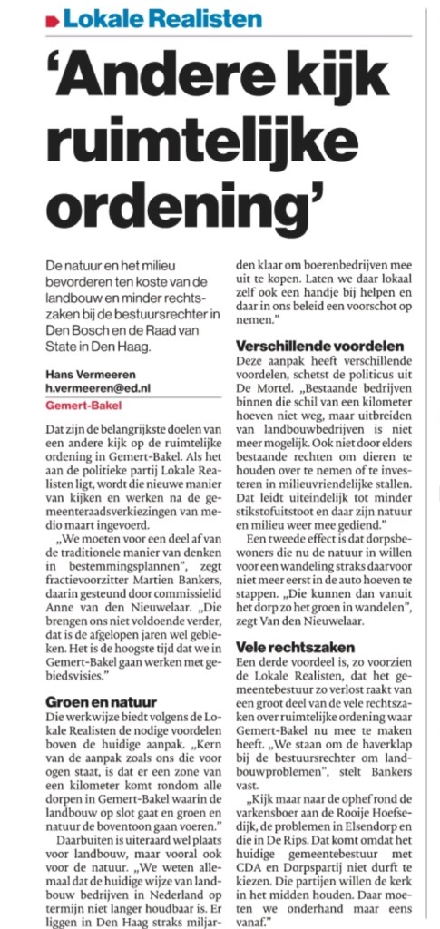 Volgens de politieke partij Lokale Realisten in de gemeenteraad van Gemert-Bakel is er in deze gemeente een andere kijk op de ruimtelijke ordening nodig. De partij wil gaan werken met zogenoemde gebiedsvisies, met daarin strakke lijnen, regels en beperkingen.