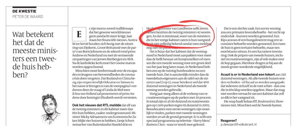 Het nieuws stond – althans voor mij – verstopt in een column in de Volkskrant van gisteren: de meeste ministers in het nieuwe kabinet hebben meerdere huizen. Er is er zelfs een die eigenaar is van maar liefst zeven huizen.