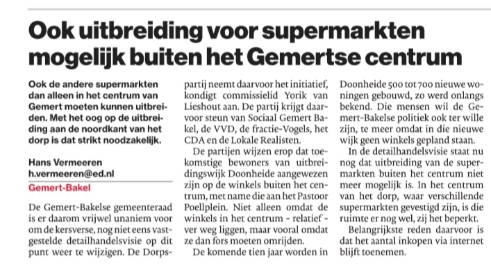 Alle supermarkten in Gemert willen uitbreiden, de komende jaren. Als het aan het gemeentebestuur ligt, gebeurt dat niet. Er is geen ruimte meer voor op de markt. Als het aan de gemeenteraad ligt, gebeurt dat wel. We zullen eens zien waar dat op uitdraait. Misschien wel op een supermarktoorlog in Gemert.