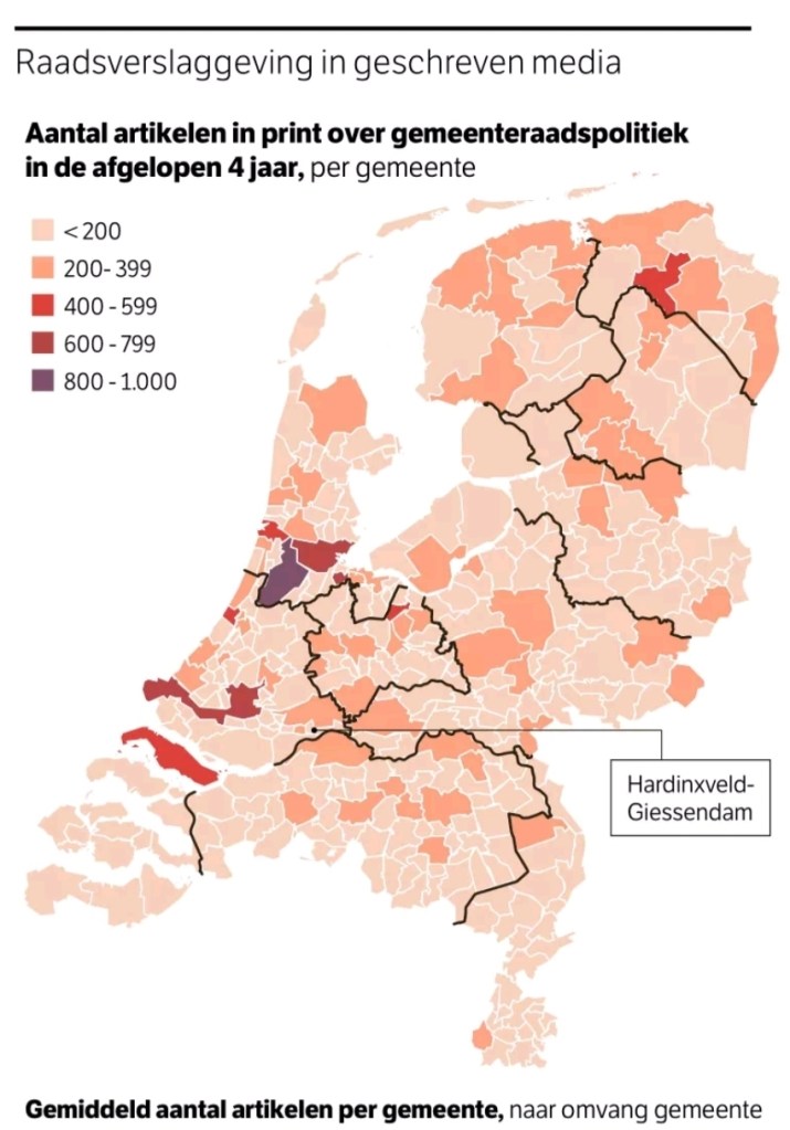 Interessante reportages in NRC dezer dagen over de gemeenteraden, de gemeenteraadsverkiezingen en de verslaggeving daarover. In dit kaartje wordt weergegeven hoeveel artikelen er de afgelopen vier jaar over de gemeenteraden zijn geschreven.