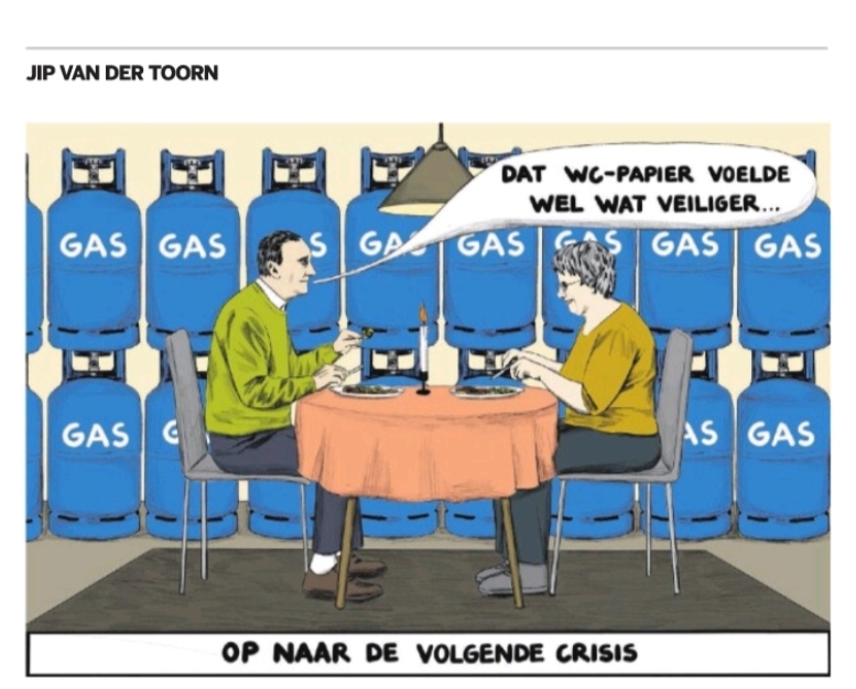 Hoewel wat er momenteel allemaal in de wereld gebeurt te triest voor woorden is, moeten we proberen toch de moed er in te houden. Met humor bijvoorbeeld, zoals in deze cartoon in de Volkskrant.