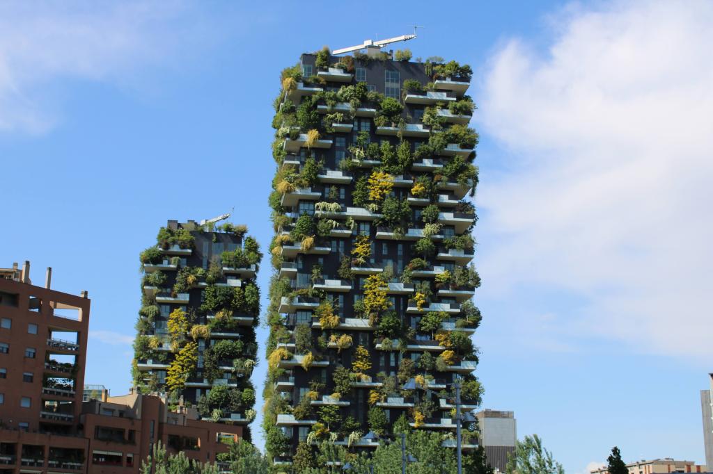 Onlangs, tijdens de meivakantie, waren we onder meer een paar dagen in Milaan: een alleszins aangename stad. Daar zagen we ook een groene toren. Maar dan echt: daar zie je door het groen nauwelijks meer een gebouw.