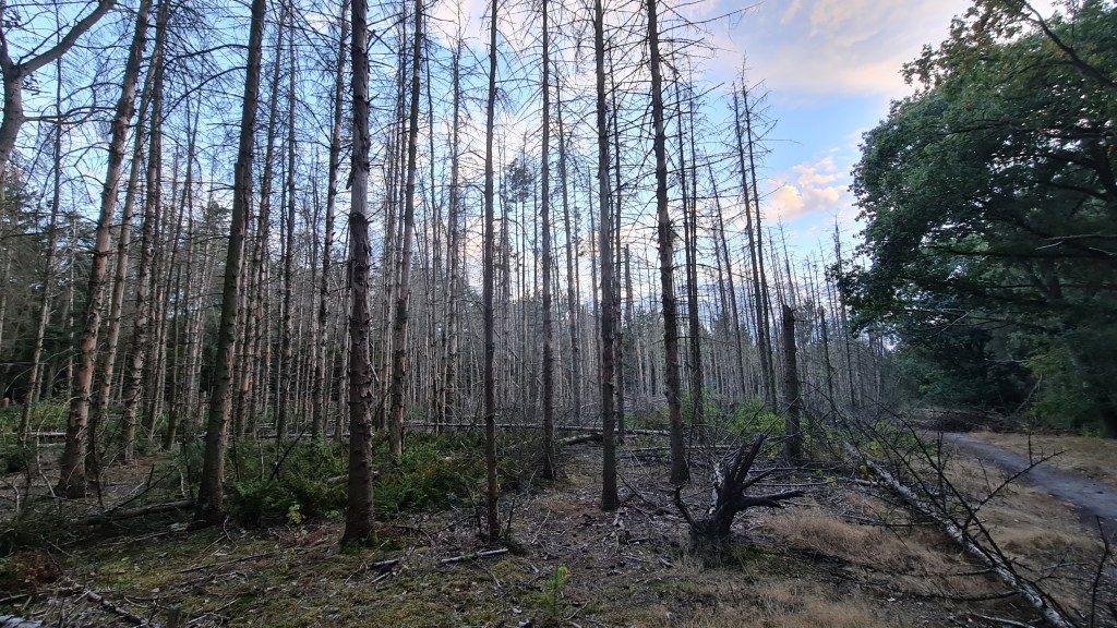 Zo droog, dat veel de dennen die er staan het loodje dreigen te leggen, zag ik gisteren tijdens een rondje om onze wijk.