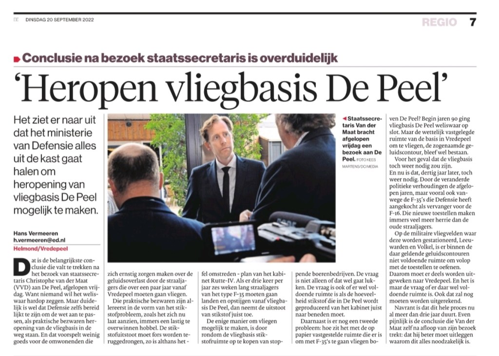 Het ziet er somber uit voor de tegenstanders van heropening van vliegbasis De Peel, net ten oosten van Gemert. De staatssecretaris lijkt vastbesloten alles uit de kast te halen om dat plan te kunnen doorzetten. Ondanks alle stikstofproblemen.