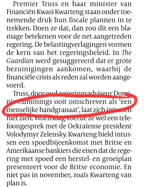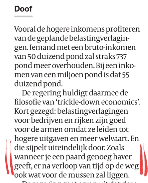 Twee knipsels uit de Volkskrant van vandaag. Het is crisis in Engeland sinds de nieuwe prime-minister Truss haar economische plannen bekend maakte: belastingverlaging voor de rijken.