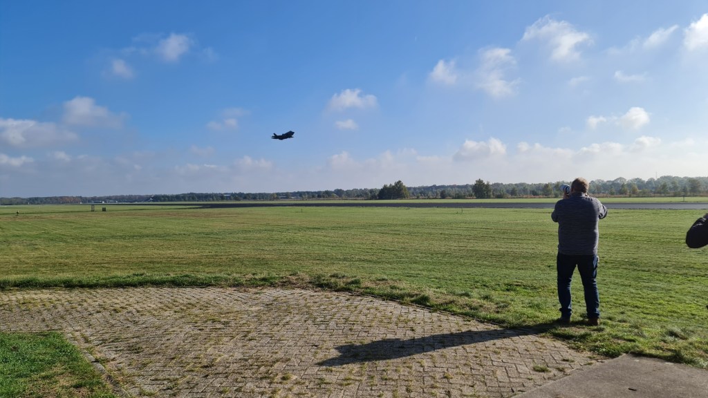 Je ziet hem bijna niet op deze foto, de straaljager F-35 van Defensie. Maar je hoort ‘ em des te beter, als je naast de landingsbaan van vliegveld De Peel in Vredepeel staat. Het is, kortom, een hele belevenis, zo’n belevingsvlucht.