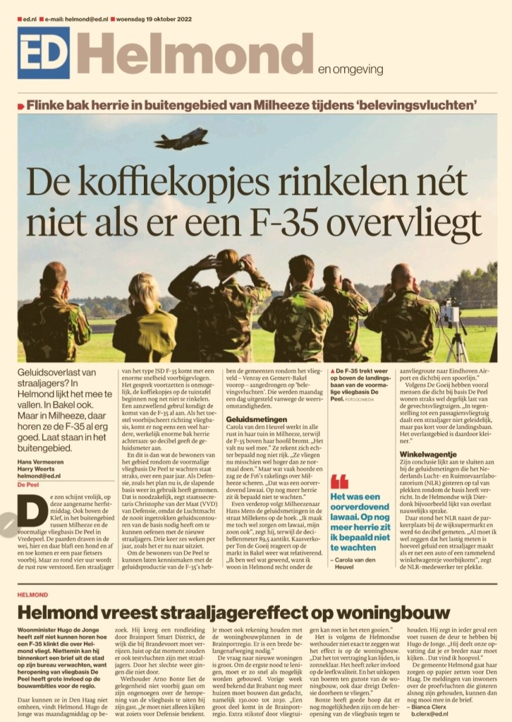 Belevingsvluchten noemt Defensie deze proef, omdat de regio dan kan beleven hoeveel herrie deze straaljagers maken. De bedoeling is dat die straaljagers straks 18 of 24 weken per jaar boven Helmond gaan vliegen. In het verhaal zet ik puntsgewijs op een rij waar het ook al weer allemaal precies om gaat.